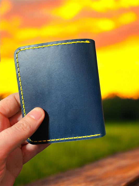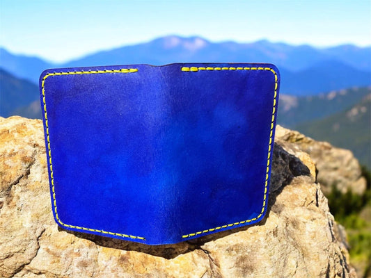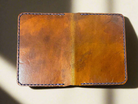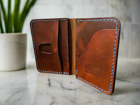 Brown Handmade leather wallet with blue waxed thread ~ American Flag stamp